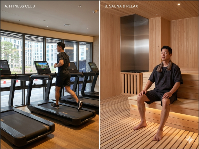 복잡한 미로를 헤맬 필요도, 엘리베이터를 갈아탈 번거로움도 없습니다. 운동복 차림으로 쓱 내려가면 피트니스부터 골프, 사우나까지 한 호흡에 해결되는 ‘원스톱 슬세권’. 이 직관적인 편리함이야말로 오티에르가 거주자의 시간을 아껴주는 가장 영리한 방식입니다