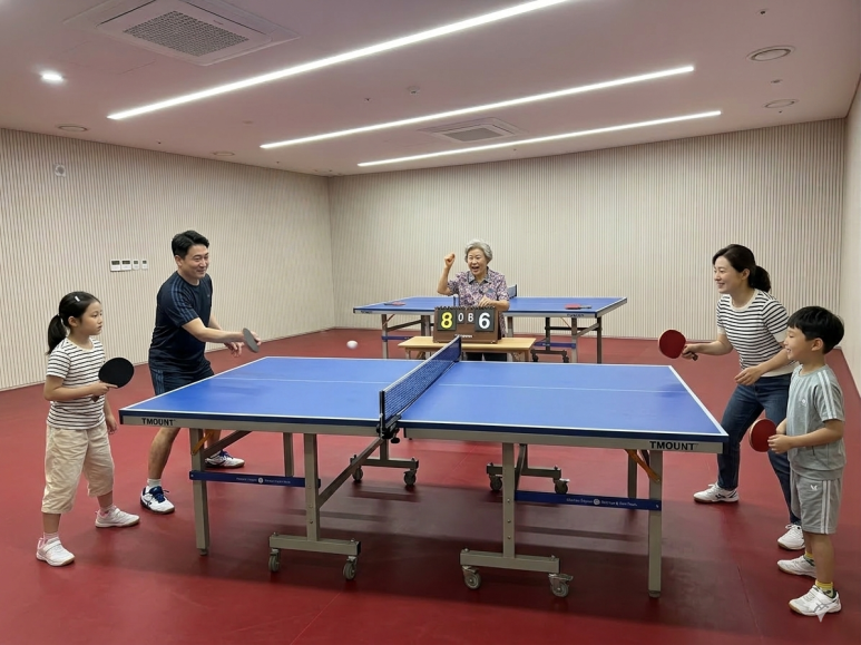 주말이면 우리 가족은 거실 소파 대신 단지 내 탁구장으로 향합니다. 세대수 대비 넉넉하게 마련된 두 개의 탁구대는, 멀리 나가지 않고도 언제든 가볍게 즐길 수 있는 우리 집만의 ‘홈 코트’가 되었죠