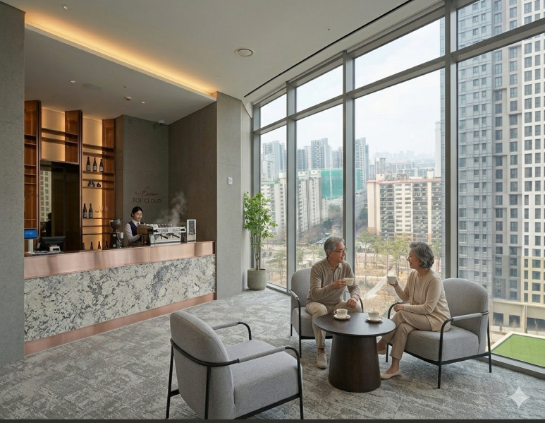 호텔 스카이라운지 못지않은 파노라마 뷰를 배경 삼아 즐기는 티 타임. 할아버지와 할머니는 그곳에서 매주 새로운 추억을 우려냅니다. 멀리 나가지 않고도 누리는 이 최고층의 여유는, 평생을 일궈온 보람을 보상받는 가장 우아한 방식입니다