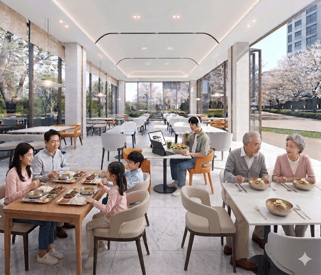 조깅 후 땀을 식히며 단지 내 다이닝 카페에 앉아 봅니다. 벚꽃 잎이 흩날리는 창밖 풍경을 보며 정갈하게 차려진 식판 한 그릇을 비워내는 시간. 요즘 신축 아파트다운 편리함에 호텔 같은 우아함이 더해진 이 아침 식사는, 저를 매일 아침 기분 좋게 깨워줄 것 같습니다