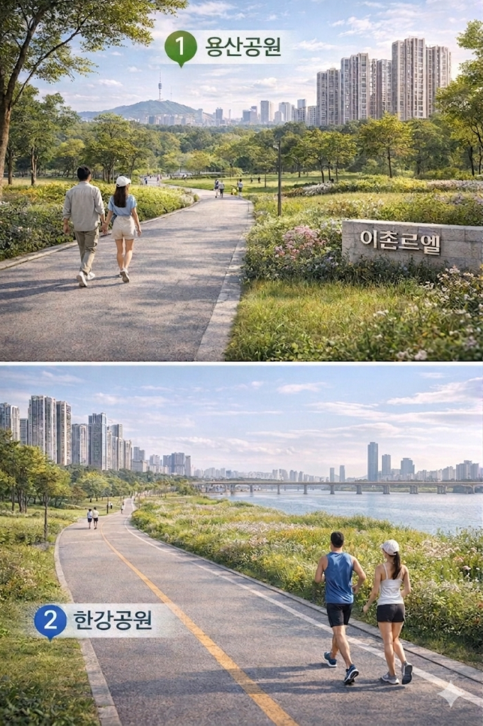 운동화 끈을 묶으며 현관을 나설 때마다 즐거운 고민이 시작될 것 같습니다. 단지 뒷길로 연결된 용산공원의 호젓한 산책로를 걸을지, 아니면 앞길로 시원하게 뻗은 한강의 활기를 마주할지. 이촌르엘에 산다는 건, 서울의 가장 귀한 두 풍경을 내 집 정원처럼 소유한다는 뜻이겠죠?