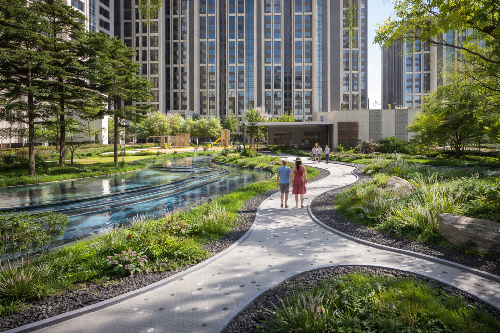 공원을 벗어나 단지로 들어와도 초록의 여운은 끝나지 않습니다. 세련된 건물 사이로 흐르는 물소리와 울창한 나무들이 만들어내는 그늘. 리모델링 단지임에도 불구하고 이토록 섬세하게 짜여진 조경 덕분에, 집으로 돌아오는 길마저 짧은 여행처럼 느껴질 것 같습니다